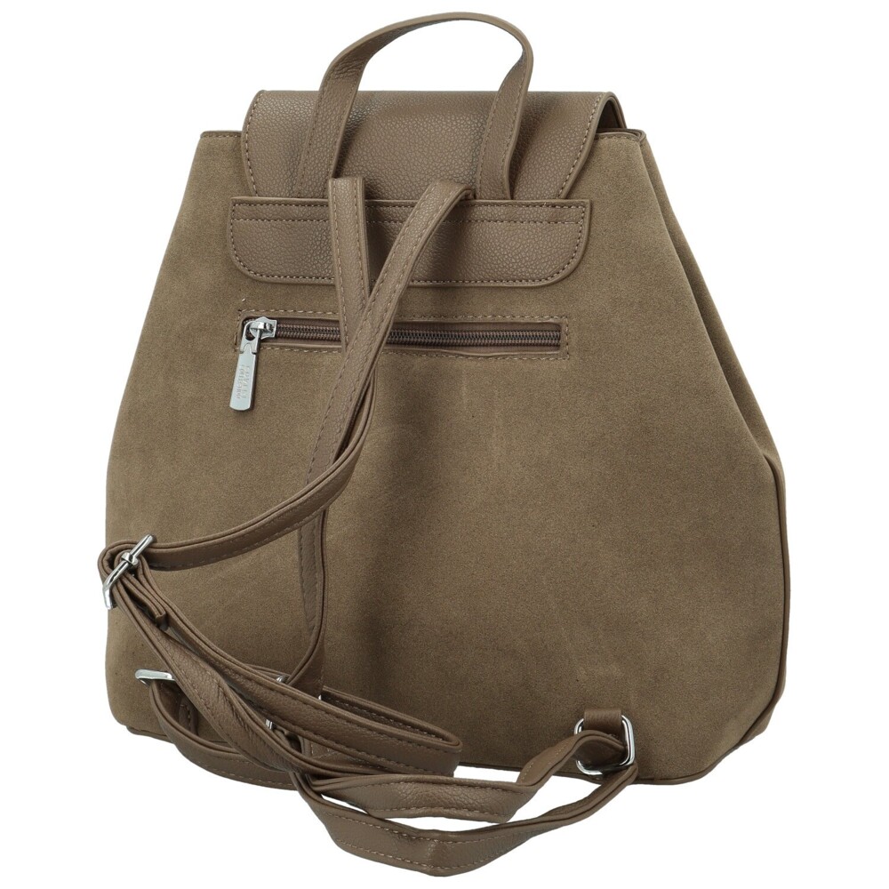 Elegantní dámský batoh z koženky, který zaujme svým promyšleným designem a kombinací materiálů. Tělo z hebké semišové koženky působí měkce a žensky, zatímco klopa a popruhy z hladké koženky dodávají celku moderní kontrast. Klopa s logem značky skrývá hlavní kapsu na zip, uvnitř najdete kapsičky v podšívce pro přehledné uspořádání věcí. Boční druky umožňují upravit tvar batohu podle potřeby, elegantně zúžit či ponechat prostornější. Nechybí zadní zipová kapsa, pevné ucho pro nošení v ruce a nastavitelné popruhy pro maximální pohodlí. Stříbrné kování podtrhuje stylový charakter batohu, který se skvěle hodí do města i na volné dny. Objednejte ještě dnes a vyzkoušejte, vrátit jej můžete až do 30 dnů!