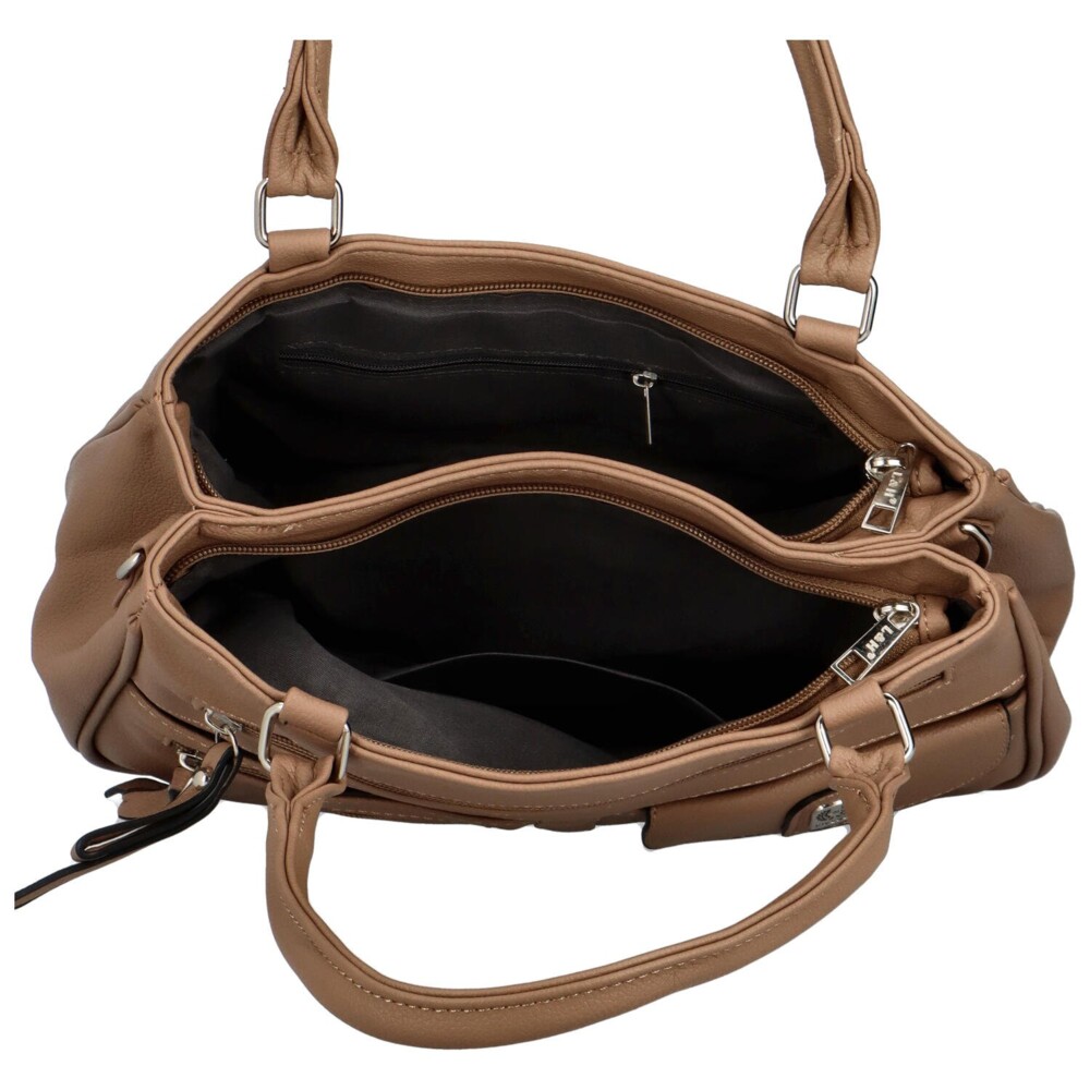 Kabelka nabízí hned dva hlavní úložné prostory, které zabezpečíte zipem. Dále nechybí ani menší vnitřní kapsy na drobnosti. Ucha jsou akorát dlouhá a pevná k pohodlnému nošení v ruce. K dispozici je však i nastavitelný popruh, díky němuž můžete kabelku nosit přes rameno nebo jako crossbody. Na přední i zadní straně najdete další zipové kapsičky. V přední části malé logo značky stříbrné barvy. Objednejte ještě dnes a vyzkoušejte, vrátit ji můžete až za 30 dnů!