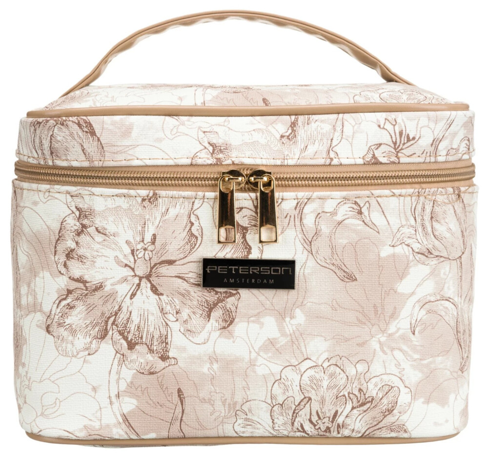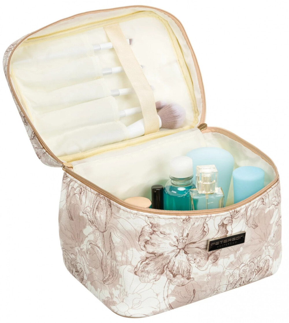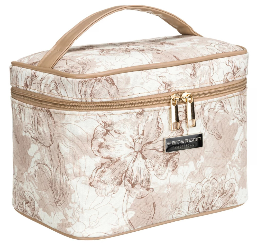Kosmetická taška s květinovým vzorem působí svěže a romanticky. Motiv květin jí dodává ženský a hravý vzhled, díky čemuž se stane stylovým doplňkem nejen na cestách. Uvnitř tašky je pět praktických přihrádek určených pro štětce na make-up, které jsou zajištěny širokou gumičkou pro udržení věcí na místě. Přední strana je zdobena kovovou plaketou s vyrytým logem Peterson. Taštička disponuje pevným uchem pro přenášení. Taštička je vyrobena z lehkého a snadno omyvatelného materiálu, takže je ideální pro každodenní použití i cestování. Objednejte ještě dnes a vyzkoušejte, vrátit ji můžete do 30 dnů!