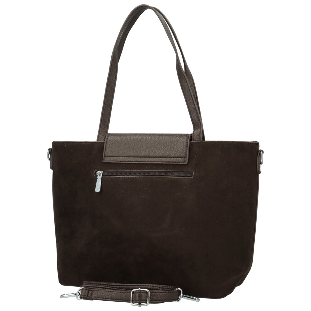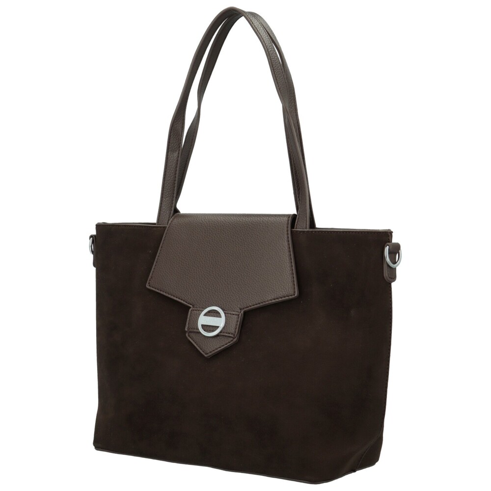 Elegantní dámská kabelka, která spojuje jemnost semišového vzhledu s nadčasovým šarmem hladké koženky. Tělo kabelky působí měkce a sametově, zatímco výrazná klopa z hladké koženky s ozdobným kovovým logem dodává celku moderní a propracovaný vzhled. Po jejím otevření se ukrývá hlavní kapsa na zip, v níž najdete praktické kapsičky v podšívce i středovou zipovou kapsu pro lepší uspořádání věcí. Na zadní straně nechybí samostatná zipová kapsa pro drobnosti, které chcete mít po ruce. Kabelku můžete nosit v ruce i přes rameno díky dlouhým uchům, nebo ji doplnit o odnímatelný dlouhý popruh. Stříbrné kování krásně ladí s teplým odstínem materiálu a podtrhuje její sofistikovaný styl. Objednejte ještě dnes a vyzkoušejte, vrátit ji můžete až do 30 dnů!