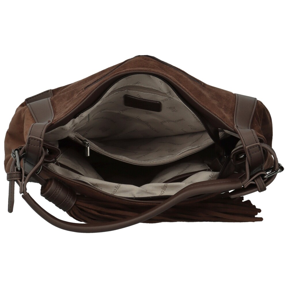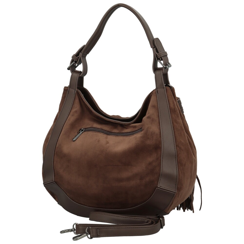 Dámská kabelka, která spojuje jemnost semiše s elegancí koženky. Hladký semišový povrch působí luxusně, zatímco koženkové prvky, pevné ucho a zaoblené pruhy na přední i zadní straně, dodávají kabelce moderní charakter. Výrazný semišový střapec na přední straně je nepřehlédnutelným detailem, který oživí celý design. Uvnitř hlavní zipové kapsy najdete praktické kapsičky v podšívce, zadní strana nabízí menší zipovou kapsičku. Díky odnímatelnému koženkovému popruhu můžete kabelku nosit jak na rameni, tak i jako crossbody. Elegantní doplněk, který podtrhne váš osobitý styl. Objednejte ještě dnes a vyzkoušejte, vrátit ji můžete až do 30 dnů!
