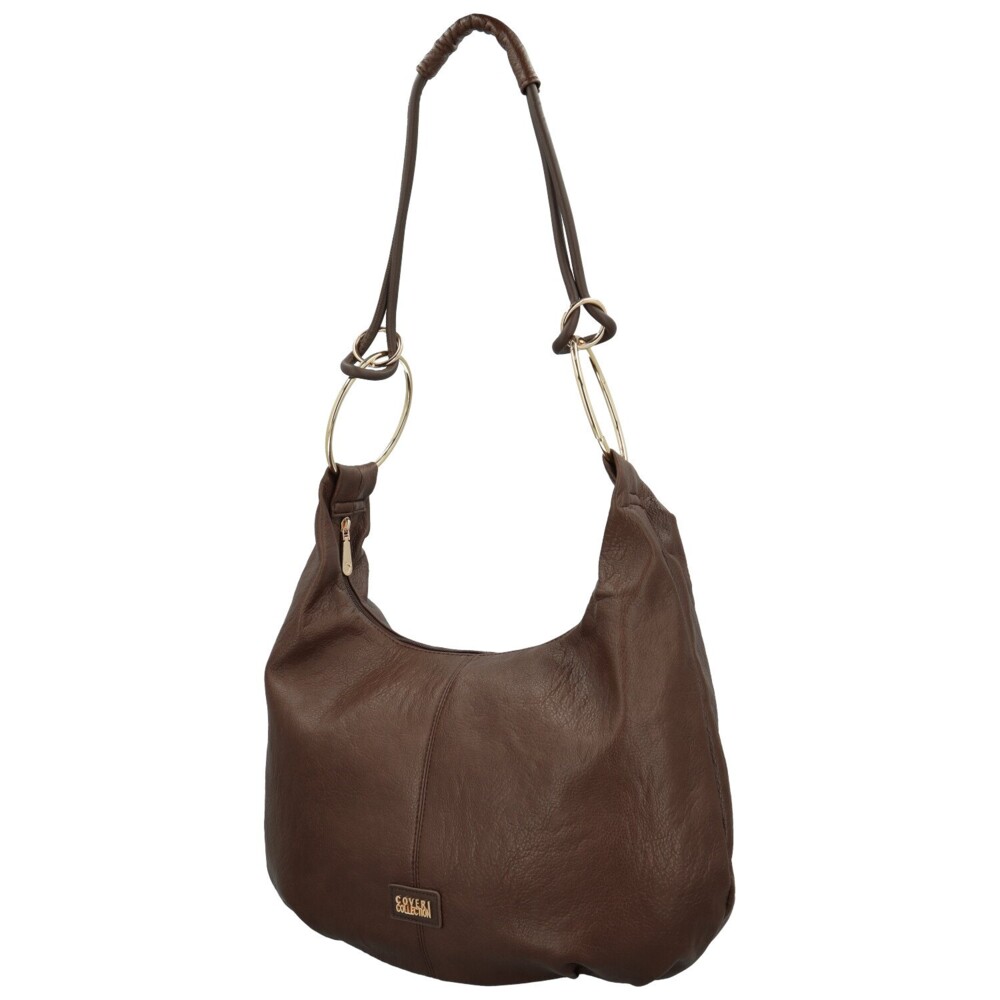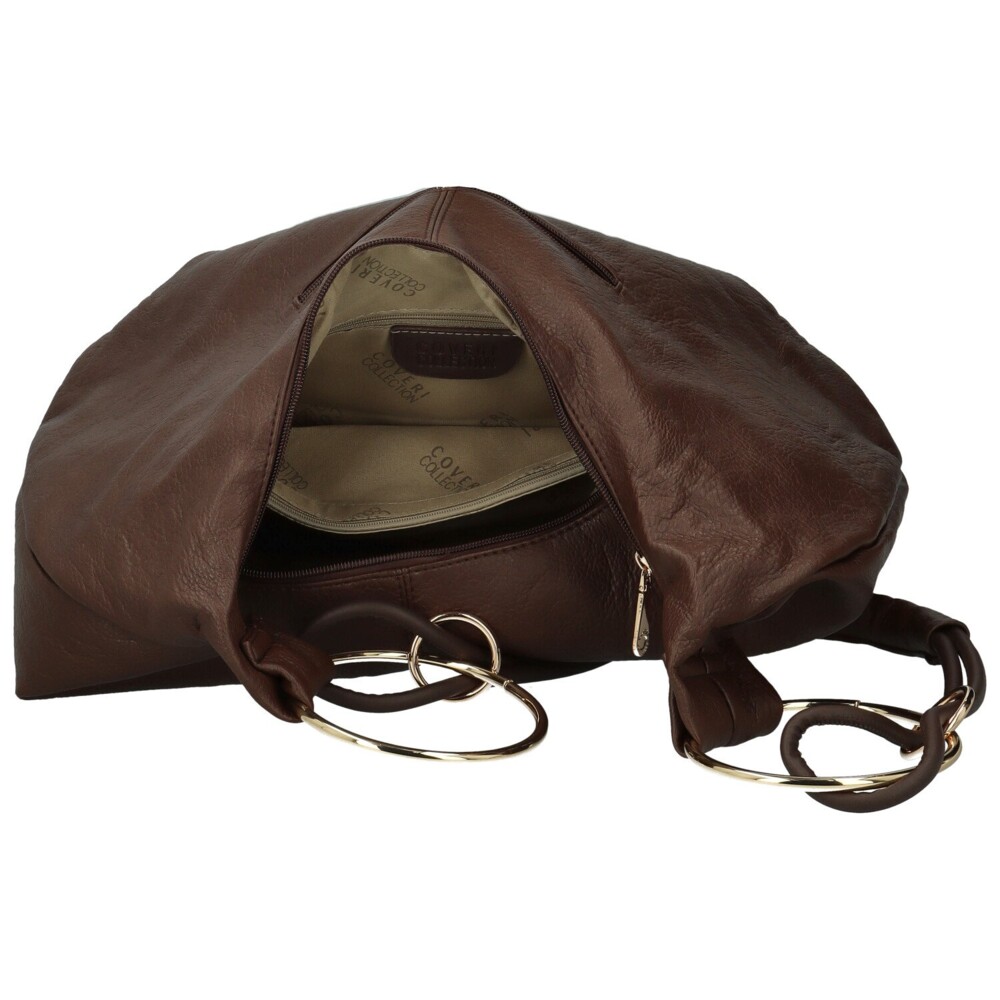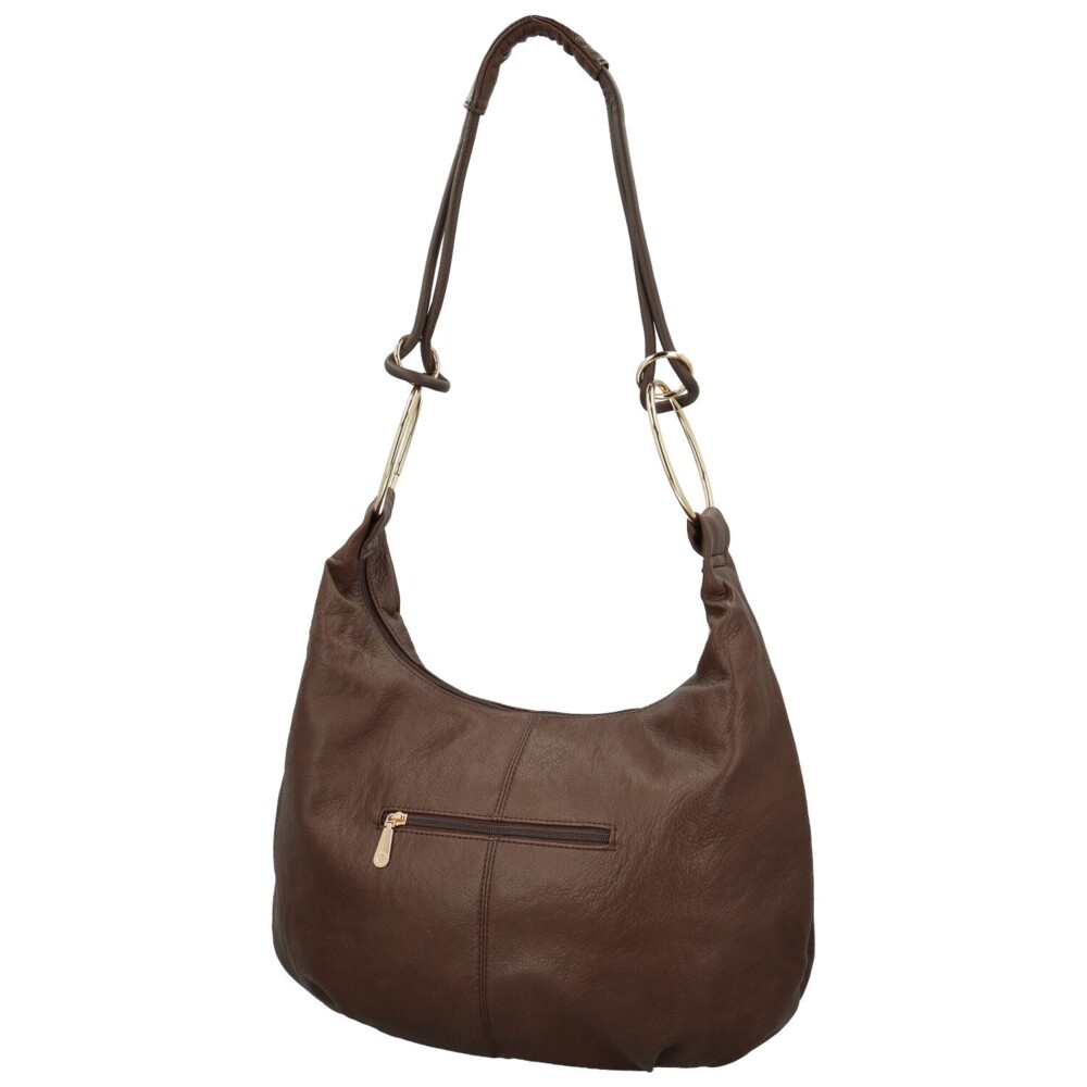 Dámská koženková kabelka, která zaujme svým moderním vzhledem. Její hladký, lehce zvrásněný povrch působí elegantně, zatímco přední stranu decentně doplňuje logo značky. Nejvýraznějším designovým prvkem jsou velké zlaté kroužky, které propojují tělo kabelky s pevným uchem. Na zadní straně se nachází praktická zipová kapsa, ideální pro uložení drobností. Hlavní prostor je uzavíratelný zipem a vnitřní uspořádání je promyšlené, kromě kapsiček v podšívce nabízí také středovou zipovou přihrádku. Zlaté kování krásně kontrastuje s barvou koženky a podtrhuje elegantní charakter modelu. Vhodná bude pro každodenní nošení i společenské příležitosti. Objednejte ještě dnes a vyzkoušejte, vrátit ji můžete až do 30 dnů!