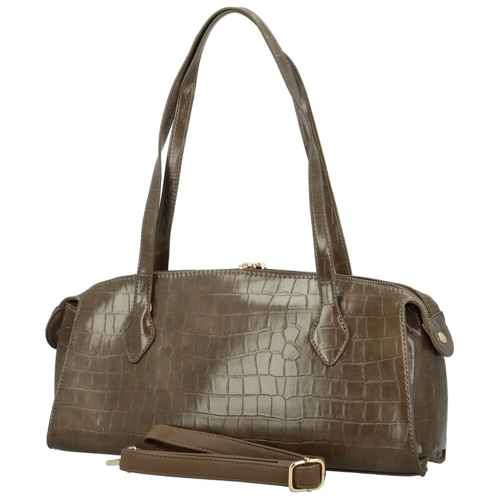 Elegantní kabelka z lesklé koženky s výrazným krokodýlím vzorem zaujme na první pohled svým luxusním vzhledem. Obdélníkový tvar na ležato působí nadčasově a dokonale doplní jakýkoli outfit, od business po večerní. Hlavní kapsa se zapíná na dvojitý zip a ukrývá přehledně členěný interiér s kapsičkami v podšívce pro vaše drobnosti. Přední stranu zdobí decentní logo značky a zlaté kování, které podtrhuje její prémiový styl. Kabelku můžete nosit pohodlně na rameni díky dlouhým uším, nebo si ji připnout křížem přes tělo pomocí nastavitelného popruhu. Stylová, praktická a šik, ideální společník pro každý den. Objednejte ještě dnes a vyzkoušejte, vrátit ji můžete až do 30 dnů!