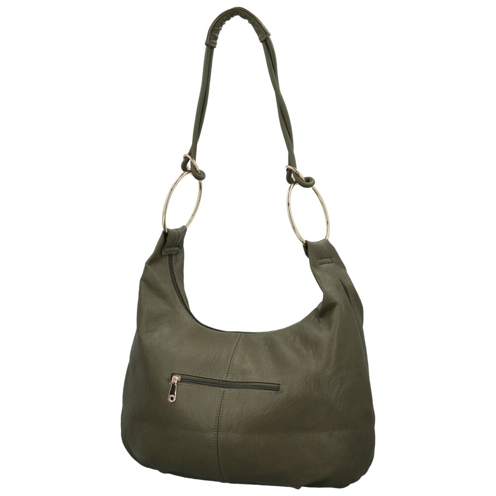 Dámská koženková kabelka, která zaujme svým moderním vzhledem. Její hladký, lehce zvrásněný povrch působí elegantně, zatímco přední stranu decentně doplňuje logo značky. Nejvýraznějším designovým prvkem jsou velké zlaté kroužky, které propojují tělo kabelky s pevným uchem. Na zadní straně se nachází praktická zipová kapsa, ideální pro uložení drobností. Hlavní prostor je uzavíratelný zipem a vnitřní uspořádání je promyšlené, kromě kapsiček v podšívce nabízí také středovou zipovou přihrádku. Zlaté kování krásně kontrastuje s barvou koženky a podtrhuje elegantní charakter modelu. Vhodná bude pro každodenní nošení i společenské příležitosti. Objednejte ještě dnes a vyzkoušejte, vrátit ji můžete až do 30 dnů!