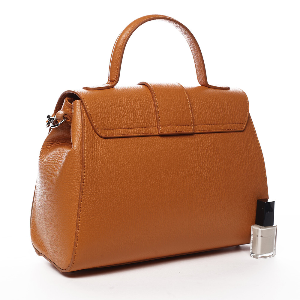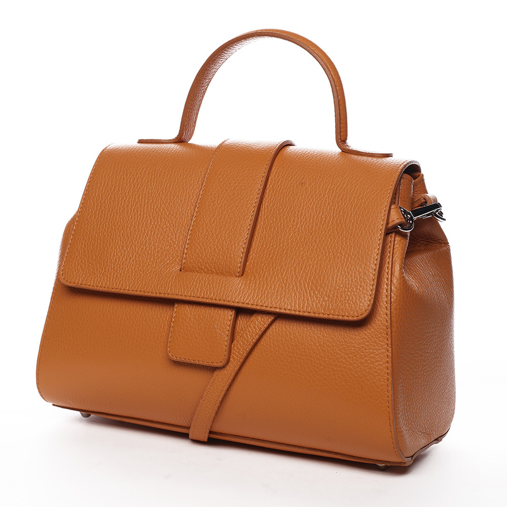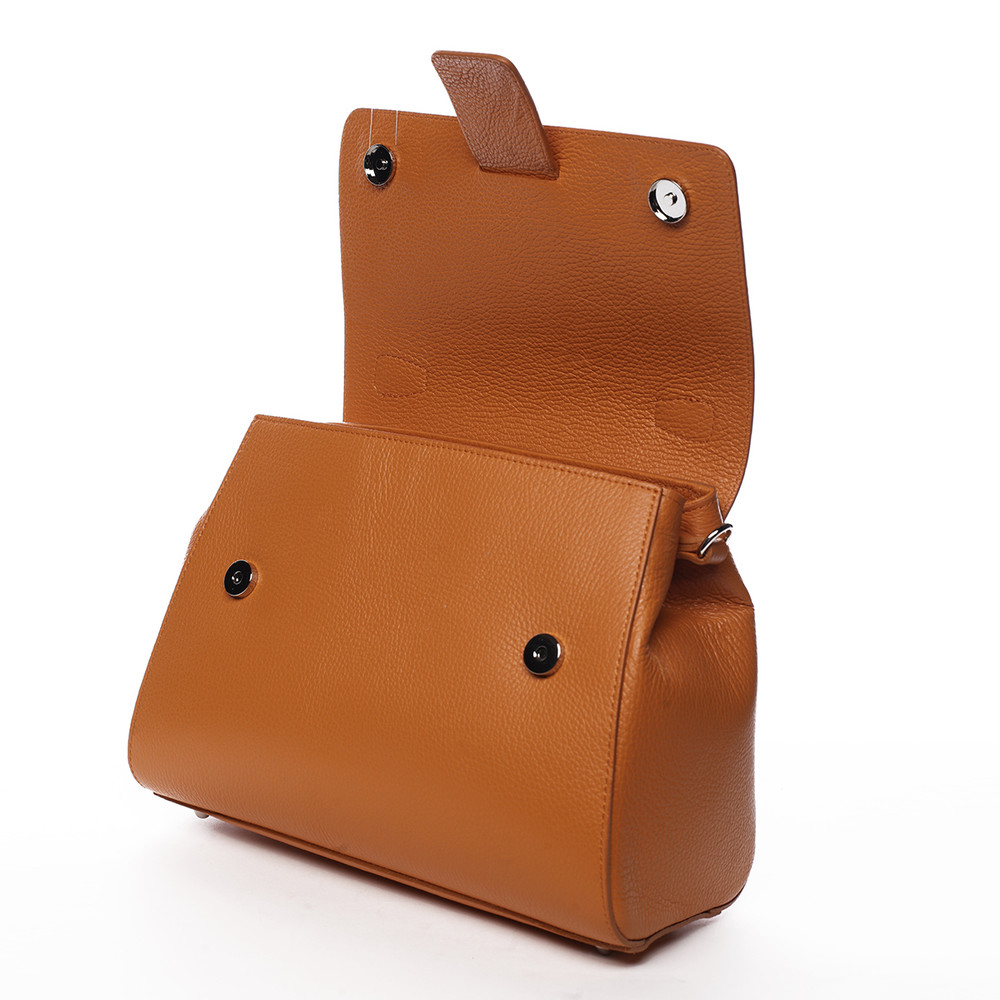 Luxusní kožená kabelka od značky ItalY. Objednejte ještě dnes a vyzkoušejte, vrátit ji můžete až za 30 dnů! Elegantní model koňakové kabelky Vás skvěle doplní ve společnosti i ve městě. Nosit ji lze v ruce, na předloktí i přes rameno. Dámská kabelka je středních rozměrů, klopa kabelky se otevírá dvěma magnetickými cvoky. Je měkčí, ale dobře drží svůj tvar, má pevnější dno a na spodní straně jsou kovové cvočky. Hlavní kapsa se otevírá zipem. Chybí zde kapsa se zipem na zadní straně.