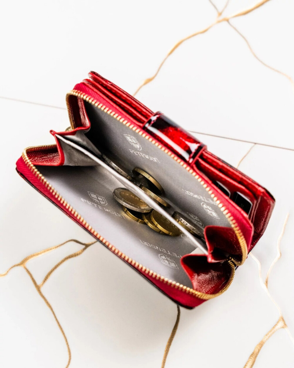 Lesk, elegance a praktická organizace v jednom, taková je tato dámská koženko-kožená peněženka. Na zapínací klopě se blyští kulaté logo značky Peterson, které dodává luxusní nádech. Po otevření se skrývá prostor pro karty a papírové peníze s RFID ochranou, takže vaše data jsou vždy v bezpečí. Zadní zipová kapsa na mince je připravena na drobné, které potřebujete mít po ruce. Peněženka v kombinaci černé a červené metalízy je perfektním doplňkem pro ty, kdo chtějí nosit styl i praktičnost v jednom. Objednejte ještě dnes a vyzkoušejte, vrátit ji můžete do 30ti dnů.