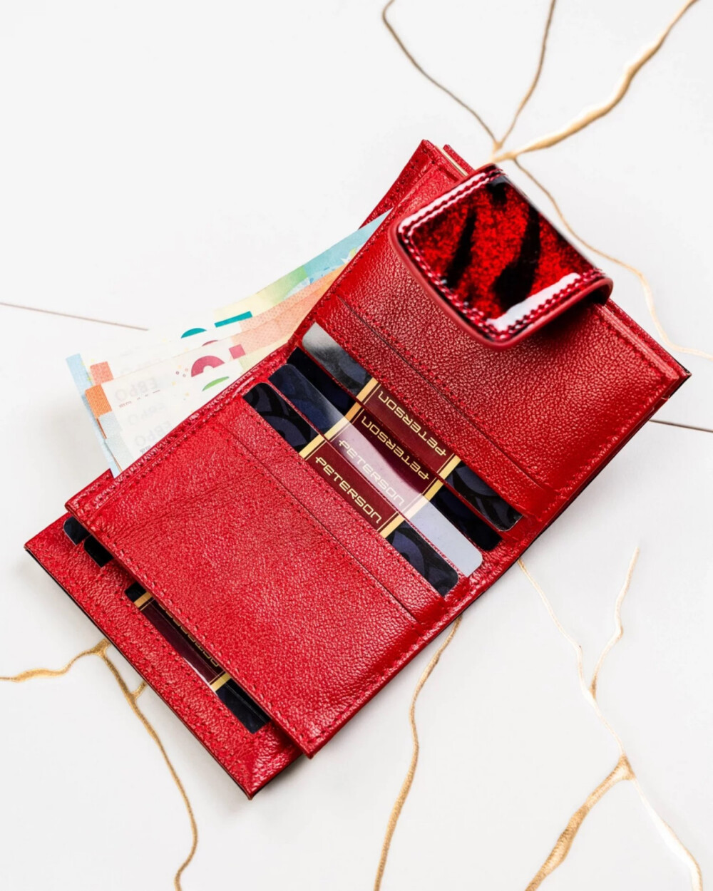 Menší dámská peněženka v lesklé černo-červené metalické kombinaci, která zaujme odvážným a sofistikovaným vzhledem. Na klopě se blyští kulaté logo značky Peterson, které dodává luxusní nádech. Po otevření se skrývají přehledné přihrádky pro karty a papírové peníze s RFID ochranou, aby vaše údaje byly v bezpečí. Kapsička na mince v kovovém rámečku přidává elegantní praktickou funkci. Peněženka dorazí v stylové dárkové krabičce, ideální pro osobní použití i jako výjimečný dárek. Objednejte ještě dnes a vyzkoušejte, vrátit ji můžete do 30ti dnů.