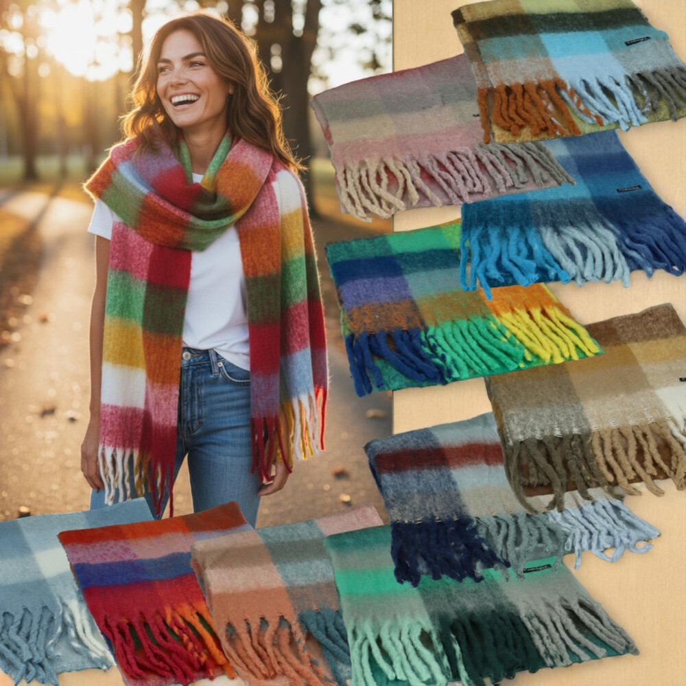 Zahalte se do barevné mozaiky tepla! Tato šála v kostkovaném designu spojuje různé tóny do harmonického vzoru, který je stejně veselý jako pohodlný. Jemný kašmír se snoubí s měkkým akrylem, takže každé objímání zimního dne je jako pohlazení. Konce zdobí lehké třásně, které dodávají šále hravý rytmus. Perfektní k džínům, kabátu i šťastné náladě. Objednejte ještě dnes a vyzkoušejte, vrátit ji můžete až do 30 dnů!