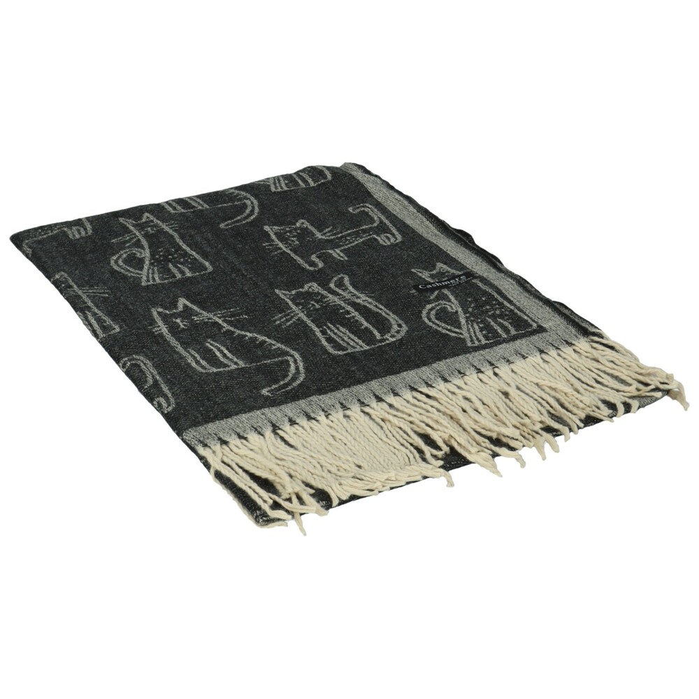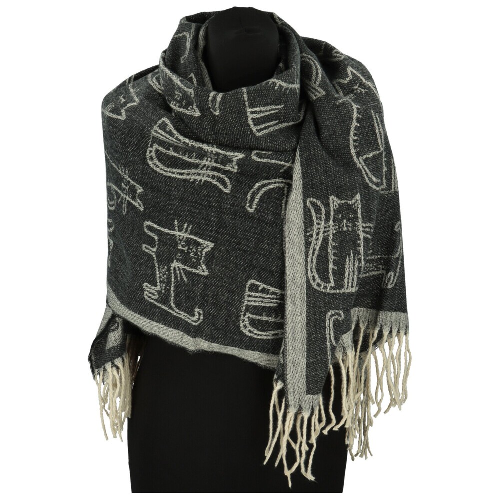 Roztomilá oboustranná šála z kašmíru s příměsí akrylu potěší všechny milovnice koček i originálních doplňků. Po celé šále ji zdobí hravý motiv koček. Z jedné strany vyniká tmavý podklad se světlými siluetami, z druhé se barvy obrátí a vzniká jemnější, svěží efekt. Bílé třásně na koncích krásně kontrastují s barvami šály a dodávají jí lehkost i šmrnc. Měkká, hebká a hřejivá, ideální společník do chladných dnů s nádechem hravé elegance. Objednejte ještě dnes a vyzkoušejte, vrátit ji můžete až do 30 dnů!