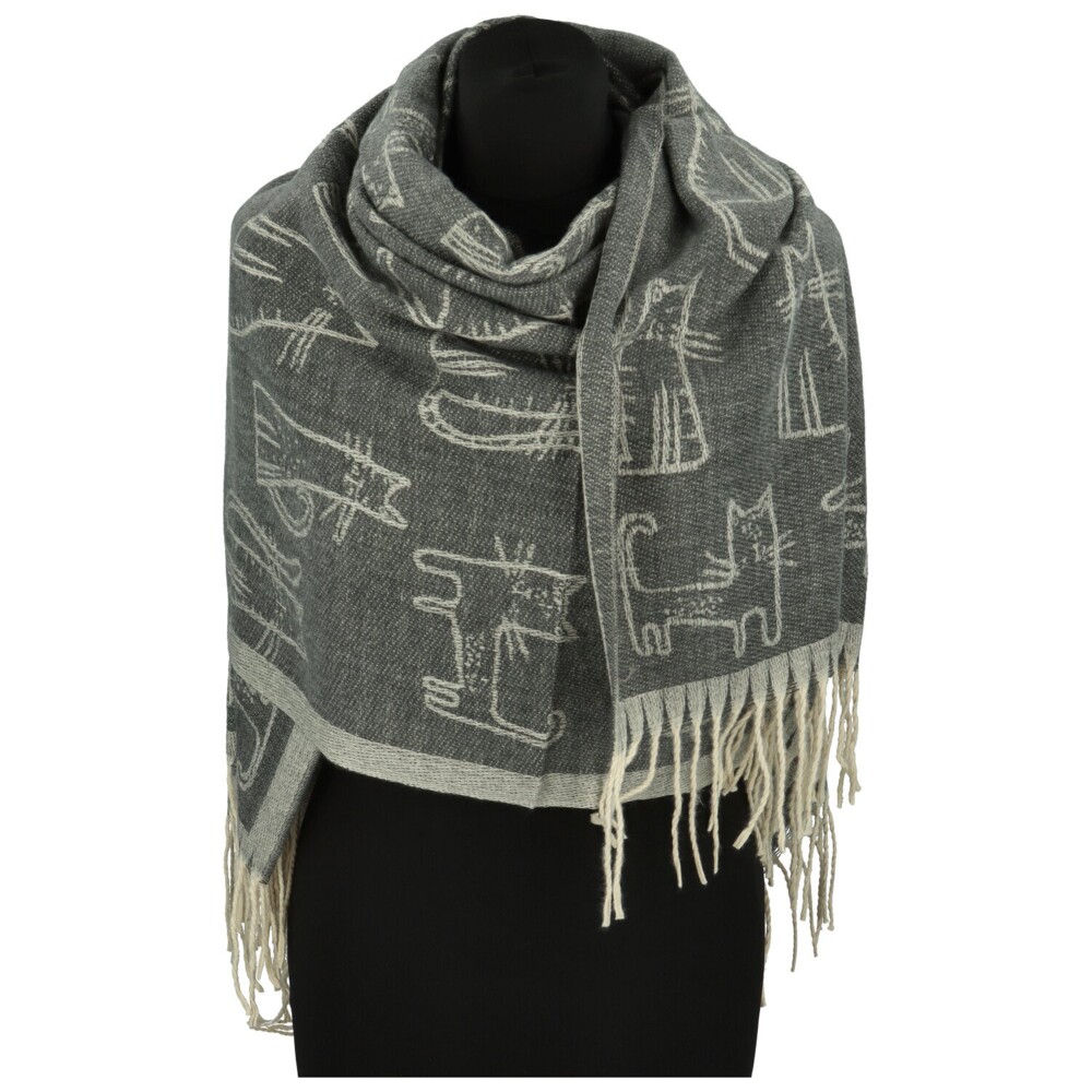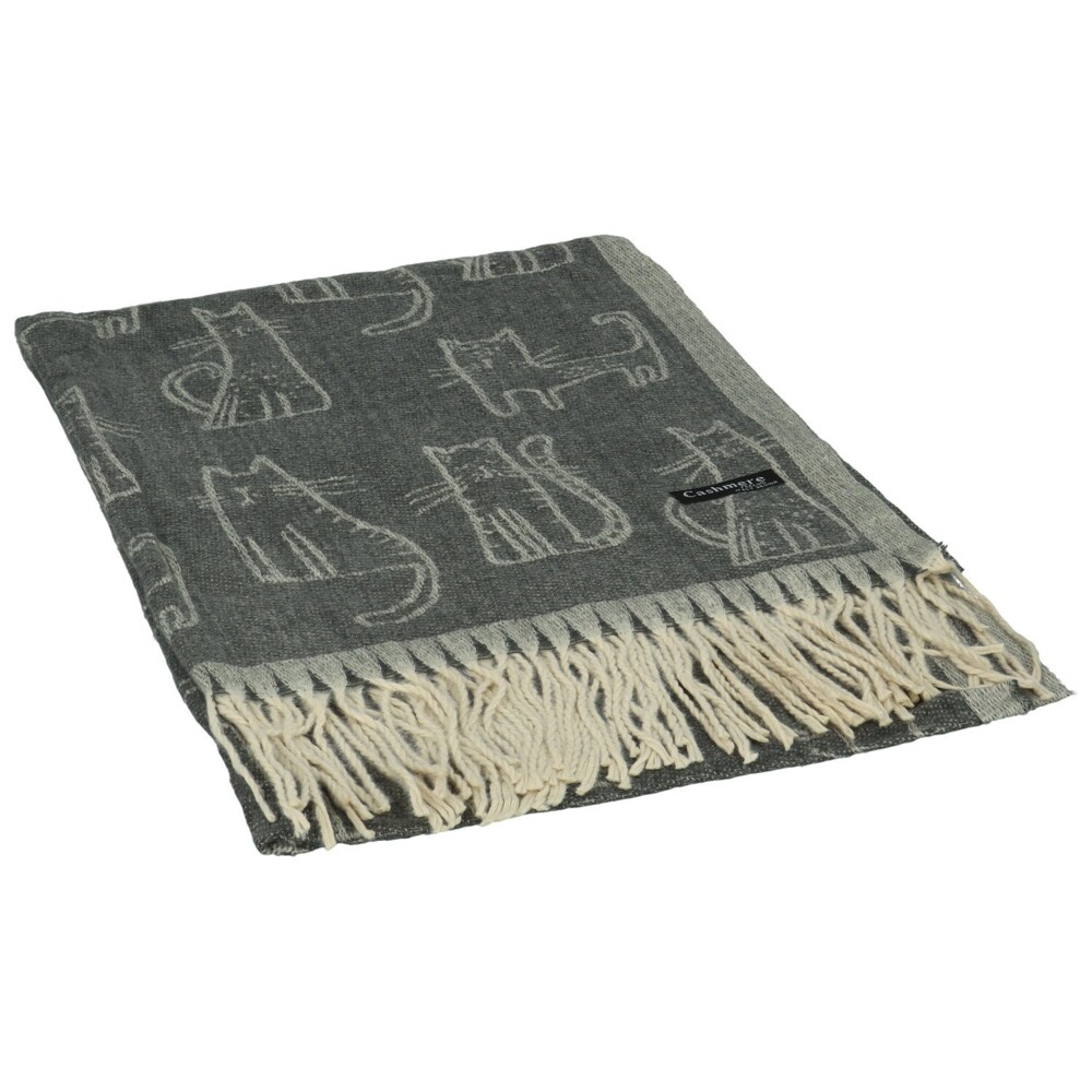 Roztomilá oboustranná šála z kašmíru s příměsí akrylu potěší všechny milovnice koček i originálních doplňků. Po celé šále ji zdobí hravý motiv koček. Z jedné strany vyniká tmavý podklad se světlými siluetami, z druhé se barvy obrátí a vzniká jemnější, svěží efekt. Bílé třásně na koncích krásně kontrastují s barvami šály a dodávají jí lehkost i šmrnc. Měkká, hebká a hřejivá, ideální společník do chladných dnů s nádechem hravé elegance. Objednejte ještě dnes a vyzkoušejte, vrátit ji můžete až do 30 dnů!