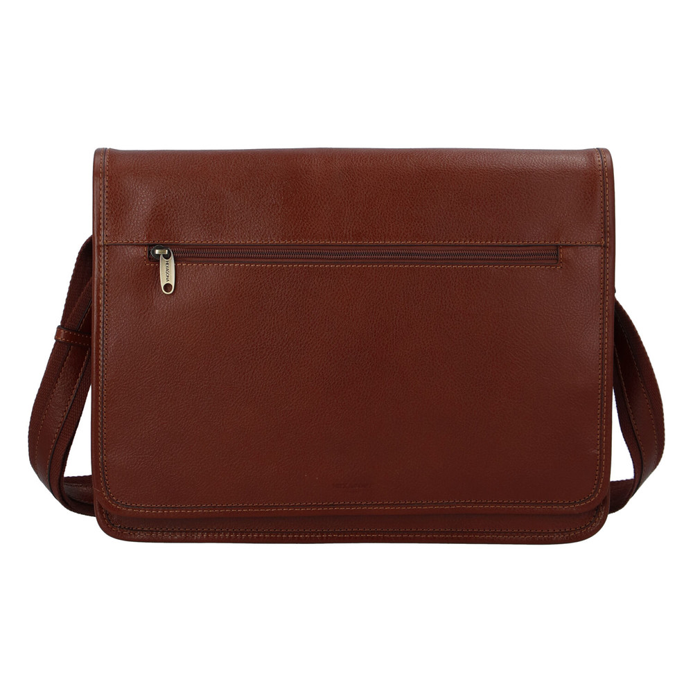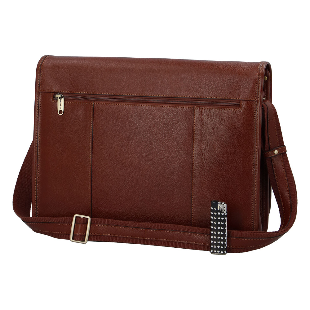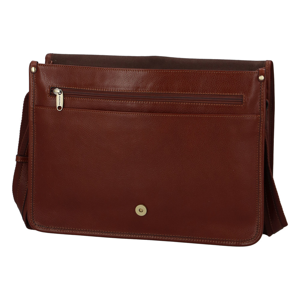 Hnědá celokožená taška pro muže, od značky Hexagona. Luxusní a kvalitní model, který je elegantní a stylový. Hodit se Vám bude samozřejmě nejen v práci, ale i ve městě. Nosit ji lze pohodlně přes rameno nebo crossbody. Pohodlně sem uložíte spisy, osobní věci i notebook (max. 33,5 x 24 cm). Taška se otevírá klopou s magnetickým cvokem, má perfektně lemované a prošívané okraje. Pod klopou jsou dvě velké kapsy, jedna volná a jedna se zipem. Hlavní kapsa se zapíná zipem a kromě kapsy na notebook zde najdete středně velkou kapsu na zip a menší volné kapsičky na osobní věci jako je telefon a pera. Zadní strana brašny je prošívaná a nechybí jí kapsa se zipem. Popruh je v kombinaci textilu a kůže. Dopřejte si skutečně mužskou záležitost.