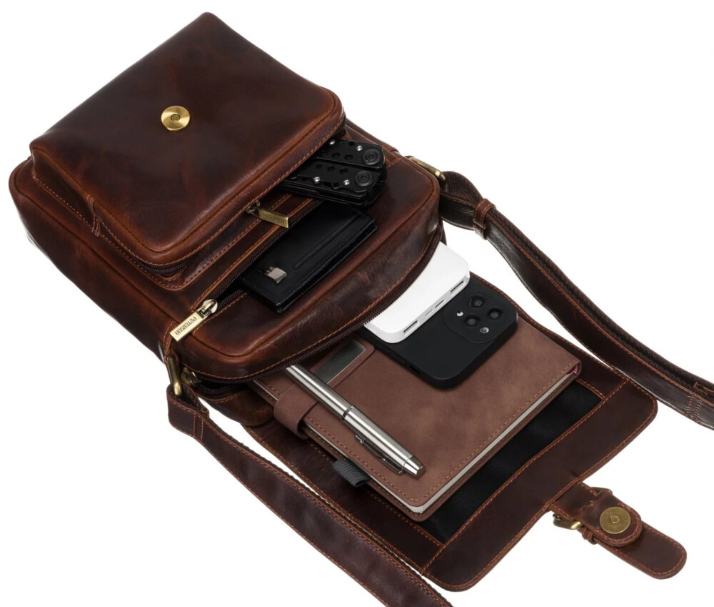 Luxusní pánská crossbody taška z hladké, pevné kůže, která zaujme precizním zpracováním a elegantními detaily. Přední straně dominuje klopa sahající do poloviny tašky, zdobená okrasnou mosaznou přezkou, jež dodává modelu klasický, nadčasový vzhled. Pod klopou se skrývá hlavní kapsa na zip s kapsičkami v podšívce pro přehledné uspořádání osobních věcí. V přední části najdete menší vypouklou zipovou kapsu a nad ní další kapsu se zipem pro drobnosti. Zadní strana je vybavena praktickou zipovou kapsou. Dlouhý nastavitelný popruh zajišťuje pohodlné nošení, zatímco mosazné kování podtrhuje elegantní a mužný charakter celé tašky. Objednejte ještě dnes a vyzkoušejte, vrátit ji můžete až za 30 dnů!