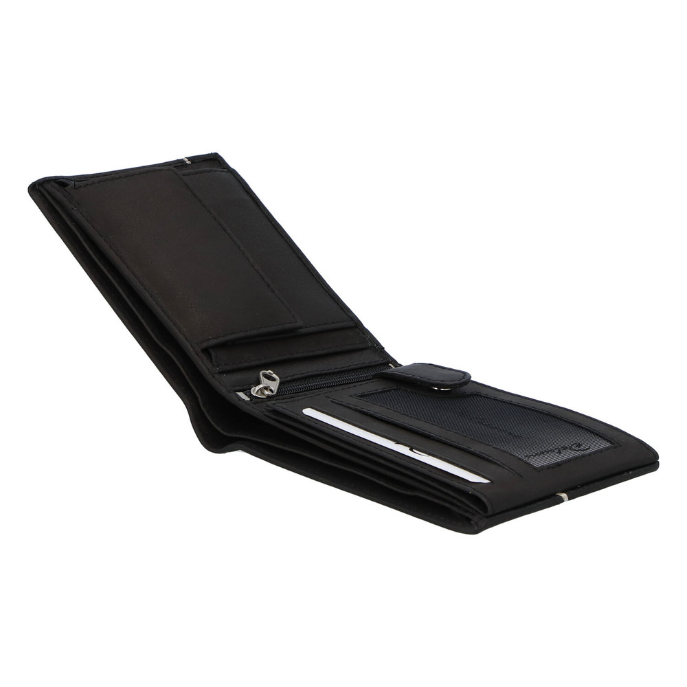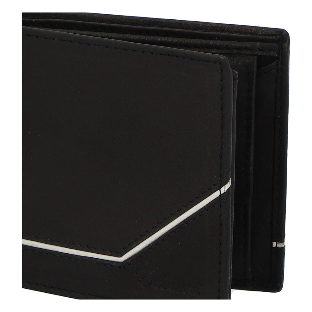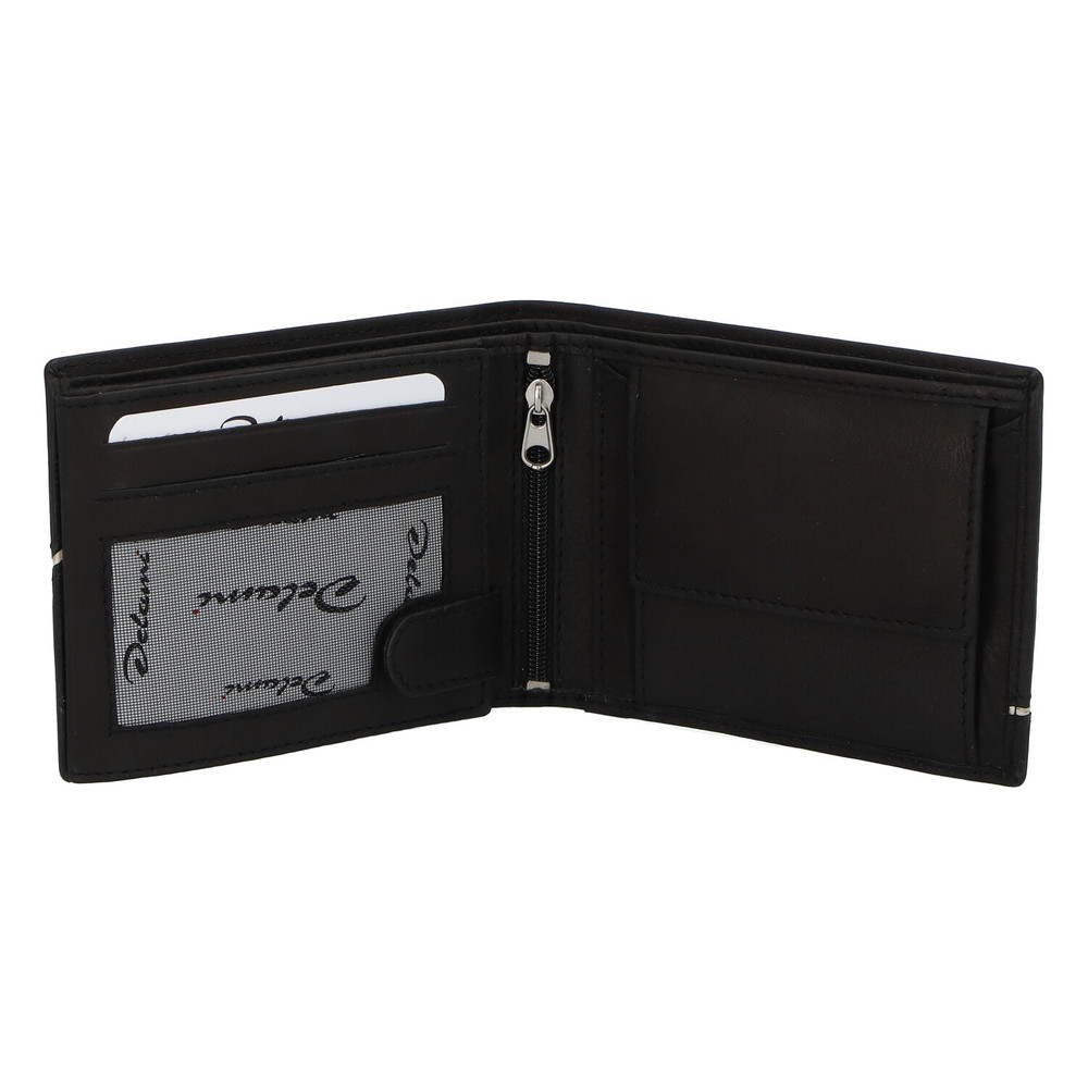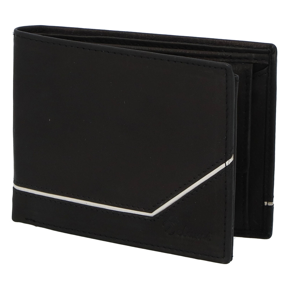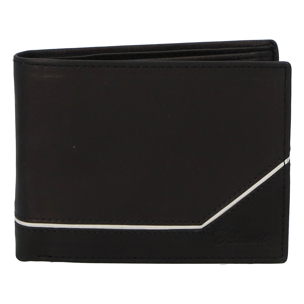 Módní černá peněženka Delami je vhodným dárkem pro každého muže. Peněženku doplňuje originální bílý pruh. Jde o módní volný typ, bez zapínání. Nabídne Vám dvě přihrádky na papírové bankovky, kapsu se cvočkem na mince, chybět Vám nebude kapsička se zipem uprostřed peněženky a ani přihrádky na doklady, vizitky a kreditní karty.